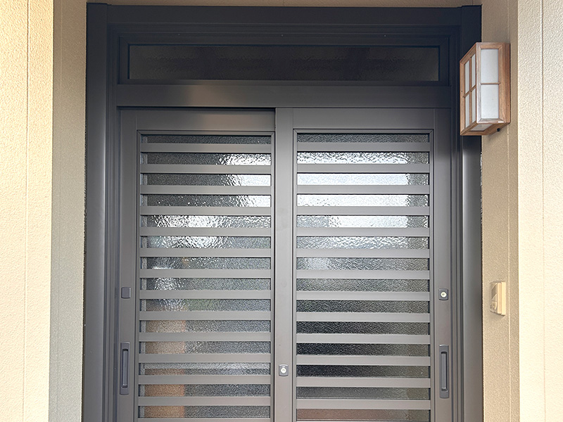 玄関ドア:LIXIL リシェント 玄関引き戸2 SG仕様 手動2枚建て ランマ付き 間口2410mm×1610mm(色:オータムブラウン) 勝手口ドア:LIXIL リシェント アルミSG仕様 C型ランマ付き 間口2490mm×790mm(色:オータムブラウン) |