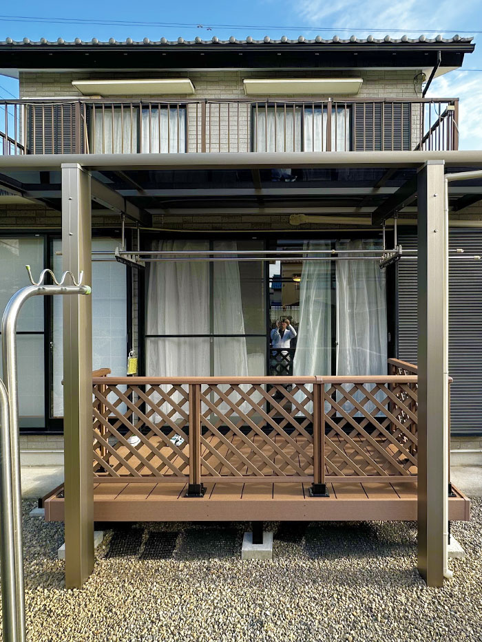 洗濯物を楽に干せるウッドデッキ
